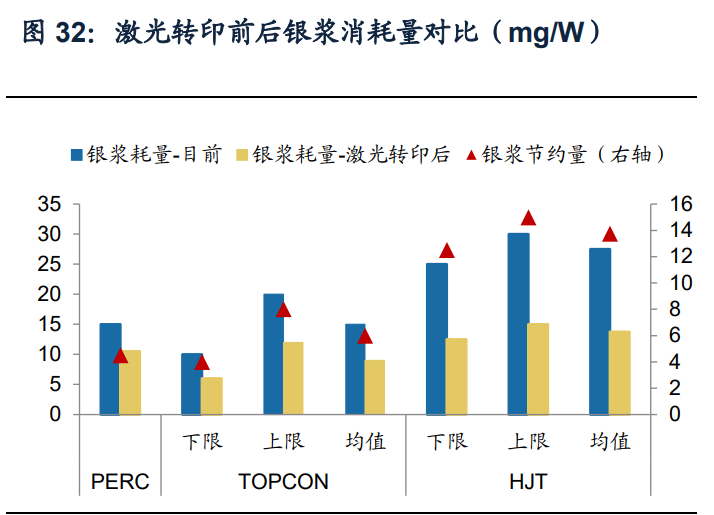 激光轉印技術有望明顯降低銀漿耗量,大幅節約漿料成本。根據帝爾激光2021年12 月28日公告的投資者溝通材料,現在PERC電池的銀漿耗量約15mg/w,TOPCon略 高為(wei) 10-20mg/w,HJT為(wei) 25-30mg/w,幾乎是PERC的兩(liang) 倍。由於(yu) N型電池的柵線更寬, 疊加雙麵用漿的特性,因此銀漿節約量會(hui) 較PERC更大。根據公司2021年12月29日 投資者關(guan) 係活動材料,公司已經可以做到18微米以下漿料節省30%,在PERC上已 經得到論證,在TOPCon、HJT等路線上的節省量會(hui) 更高。