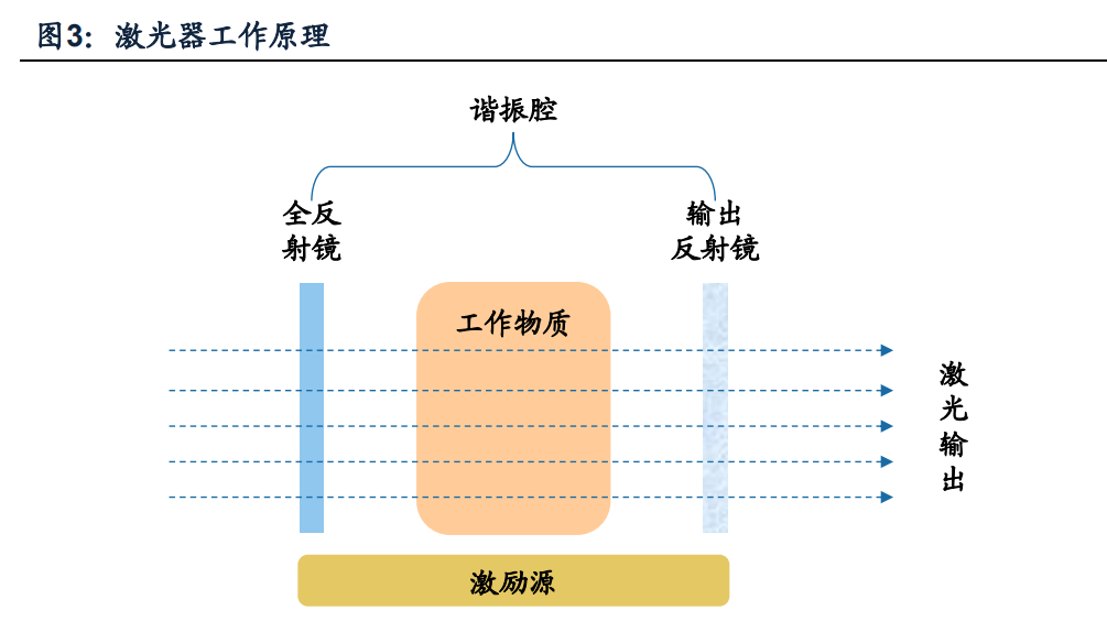 激光產(chan) 生於(yu) 激光器,激光器由增益介質、泵浦源、光學諧振腔組成。根據海目星招 股說明書(shu) ,增益介質是光子產(chan) 生的源泉,通過吸收泵浦源產(chan) 生的能量,使增益介質 從(cong) 基態躍遷到激發態。由於(yu) 激發態為(wei) 不穩定狀態,此時,增益介質將釋放能量回歸 到基態這一穩態。在此釋能過程中,增益介質產(chan) 生出光子,且這些光子在能量、波 長、方向上具有高度一致性,它們(men) 在光學諧振腔中不斷反射,往複運動,最終通過 半反射鏡射出激光器,形成激光束。這一形成原理使得激光具有極好的方向性、亮 度、單色性和相幹性,能做到將光束限製在幾個(ge) 毫弧度立體(ti) 角內(nei) ,使能量高度集中。