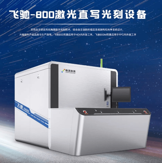 5月28日,國內(nei) 領先的激光直寫(xie) 光刻機製造商——中山新諾科技通過其官方微信公眾(zhong) 號,首度公布應用於(yu) 高階HDI、FPC工序的飛馳700、飛馳800及衍生飛馳700M、飛馳800M四款新設備。