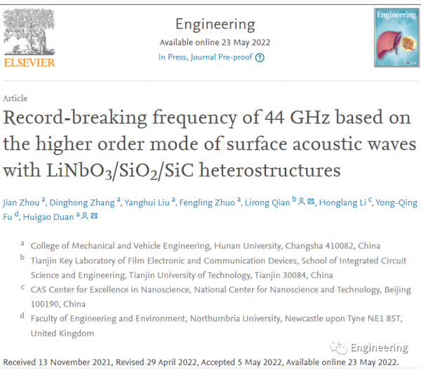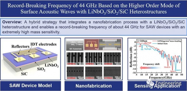 聲表麵波(Surface Acoustic Wave, SAW)是沿物體(ti) 表麵傳(chuan) 播的一種彈性波, 是由英國物理學家瑞利於(yu) 19世紀80年代在研究地震波的過程中偶爾發現的一種能量集中於(yu) 地表麵傳(chuan) 播的聲波。1965年,美國的R. M. White在壓電基板上製備出叉指換能器,成功地人為(wei) 激發出SAW,獲得了SAW器件在電子學器件應用方麵的關(guan) 鍵性突破,大大加速了SAW技術的應用發展。目前SAW器件已廣泛應用於(yu) 溫度、壓力、質量等物理參數傳(chuan) 感,神經性毒劑和糜爛性毒劑等化學戰劑痕量檢測,以及DNA、蛋白質等高精度生物傳(chuan) 感領域。在這些傳(chuan) 感領域中,微質量、濕度傳(chuan) 感、化學戰劑痕量檢測以及高精度生物傳(chuan) 感等是基於(yu) SAW的質量負載效應(即吸附質量導致頻率偏移),其傳(chuan) 感靈敏度與(yu) 器件的頻率正相關(guan) 。因此,提高SAW傳(chuan) 感器靈敏度需要提高SAW器件的工作頻率。 目前由於(yu) 換能器叉指尺寸較大以及壓電襯底材料聲速偏低等原因,SAW器件的工作頻率一般在3 GHz以下,難以滿足超高頻SAW傳(chuan) 感需求。針對上述挑戰,湖南大學段輝高教授團隊聯合天津理工大學、國家納米科學中心、英國諾桑比亞(ya) 大學等機構的研發人員,通過開發極限納米加工工藝,在LiNbO3/SiO2/SiC異質結構襯底材料上製作了波長為(wei) 160 nm、線寬為(wei) 35 nm的叉指換能器,實現了最高工作頻率約為(wei) 44 GHz的超高頻SAW諧振器,刷新了目前SAW器件的工作頻率紀錄。同時,該研究還實驗驗證了44 GHz超高頻下的微質量傳(chuan) 感應用,獲得的質量靈敏度高達33151.9 MHz·mm2·μg−1,約為(wei) 傳(chuan) 統低頻SAW器件的4000倍、傳(chuan) 統石英微天平(QCM)器件的1011倍,為(wei) 超高頻SAW器件的開發利用提供了新思路,相關(guan) 工作將於(yu) 近日發表在中國工程院院刊Engineering上。 該論文的通訊作者為(wei) 湖南大學段輝高教授和天津理工大學錢莉榮博士,第一作者為(wei) 湖南大學周劍博士,英國諾桑比亞(ya) 大學Yongqing Fu教授及國家納米科學中心的李紅浪研究員在理論分析和器件仿真上給予了指導。該研究得到了國家自然科學基金、湖南省科技攻關(guan) 項目、廣東(dong) 省重點研發計劃項目等資助。