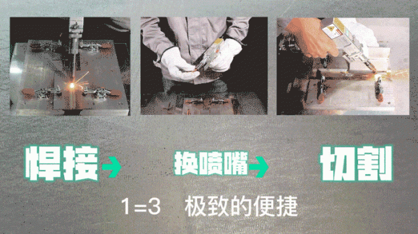 幾何光子三合一激光頭之所以說是“真三效合一”,是因為(wei) 我們(men) 在焊接、切割、清洗的工藝參數優(you) 秀的前提下,切換不同模式隻需10秒鍾:從(cong) 焊接到切割隻需更換噴嘴,從(cong) 切割到清洗隻需擰下槍管。更換簡易,三效合一才會(hui) 有實際的應用場景,我們(men) 站在用戶的角度設計這款產(chan) 品。