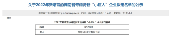 近日,湖南省工信廳發布了《關(guan) 於(yu) 2022年新培育的湖南省專(zhuan) 精特新“小巨人”企業(ye) 擬定名單的公示》,湖南大科激光有限公司榜上有名!