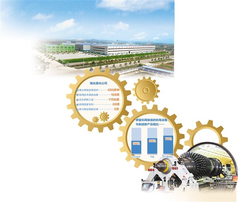 通過持續研發激光熔覆材料、激光表麵強化等核心技術,挖掘產(chan) 品全生命周期價(jia) 值,瑞兆激光公司修複和再製造的機電設備性能和質量均達到甚至超過原產(chan) 品,與(yu) 製造新產(chan) 品相比,實現節約成本50%、節能60%、節約原材料70%。