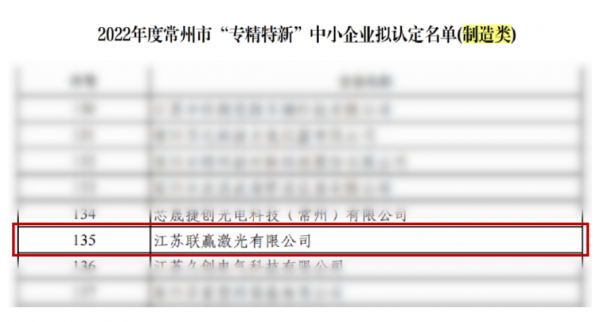 近日,常州市工信局發布2022年度常州市“專(zhuan) 精特新”中小企業(ye) 擬認定名單,深圳市聯贏激光股份有限公司(以下簡稱:聯贏激光)全資子公司江蘇聯贏激光有限公司(以下簡稱:江蘇聯贏)憑借在技術創新、科技研發與(yu) 成果轉化等方麵的突出表現榮登榜單!