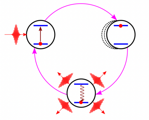 圖4. 原子的激光冷卻。通過磁場與(yu) 光場的配合,讓原子吸收一個(ge) 速度與(yu) 其相反的光子,隨後往四周隨機發射光子。平均下來,相當於(yu) 在速度方向上減速。這個(ge) 過程是一個(ge) 循環,也正是因為(wei) 這個(ge) 循環過程,所以原子才能持續冷下來。