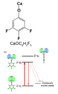 盡管任意多原子分子的循環躍遷很難找,但如果多原子分子有光循環中心(Optical cycling center,簡稱OCC),事情就會(hui) 好辦很多。舉(ju) 個(ge) 例子,CaF分子中的Ca原子外層有兩(liang) 個(ge) 電子,其中一個(ge) 電子會(hui) 和F形成化學鍵,剩下的一個(ge) 自由電子圍繞整個(ge) 分子做運動。但這時,由於(yu) Ca帶正電,F拿走一個(ge) 電子之後帶負電,會(hui) 天然形成一個(ge) 電場把自由電子往Ca原子附近推[1,4]。換句話說,這時候的自由電子主要繞Ca原子轉動(電子在Ca原子附近的概率非常大)。
