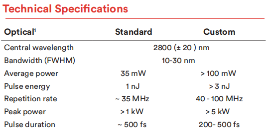 Femtum公司核心產(chan) 品包括2.8um光纖飛秒激光器、2.8-3.4um可調諧飛秒激光器以及2.8um納秒激光器,詳細參數如下: