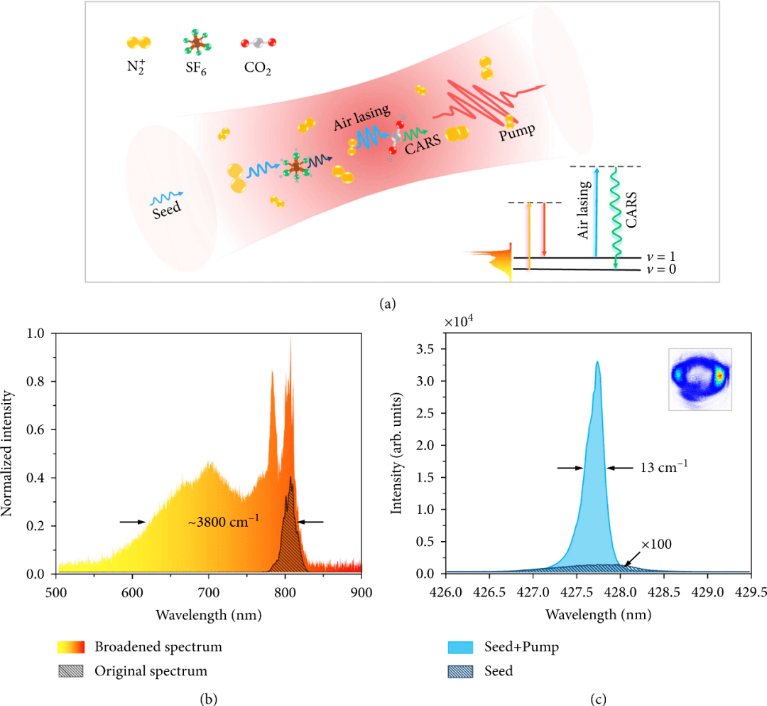 飛秒激光與(yu) 空氣分子的極非線性相互作用激發了分子氮離子的光學增益,並實現了1000倍以上的種子放大,從(cong) 而產(chan) 生線寬為(wei) 13 cm-1的428 nm空氣激光。
