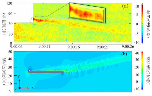 為(wei) 進一步測試雷達觀測性能和環境適應性,團隊在安徽省宿州市高鐵站實地測量了高速列車尾流中的風場結構。雷達在無人值守下連續穩定工作超過100小時,獲得了3米和0.1秒高時空分辨率下的350公裏每小時的高鐵尾流連續觀測,並首次利用激光雷達捕捉到高鐵尾流中類似於(yu) 馮(feng) 卡門渦街的風場結構,與(yu) 計算流體(ti) 力學模擬結果高度一致。