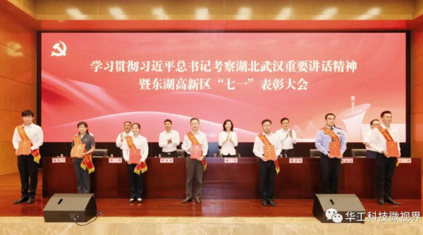 7月6日,東(dong) 湖高新區召開學習(xi) 貫徹習(xi) 近平總書(shu) 記考察光穀重要講話精神暨“七一”表彰大會(hui) ,華工科技獲評基層黨(dang) 建創新項目,馬新強董事長參加會(hui) 議並作交流發言。