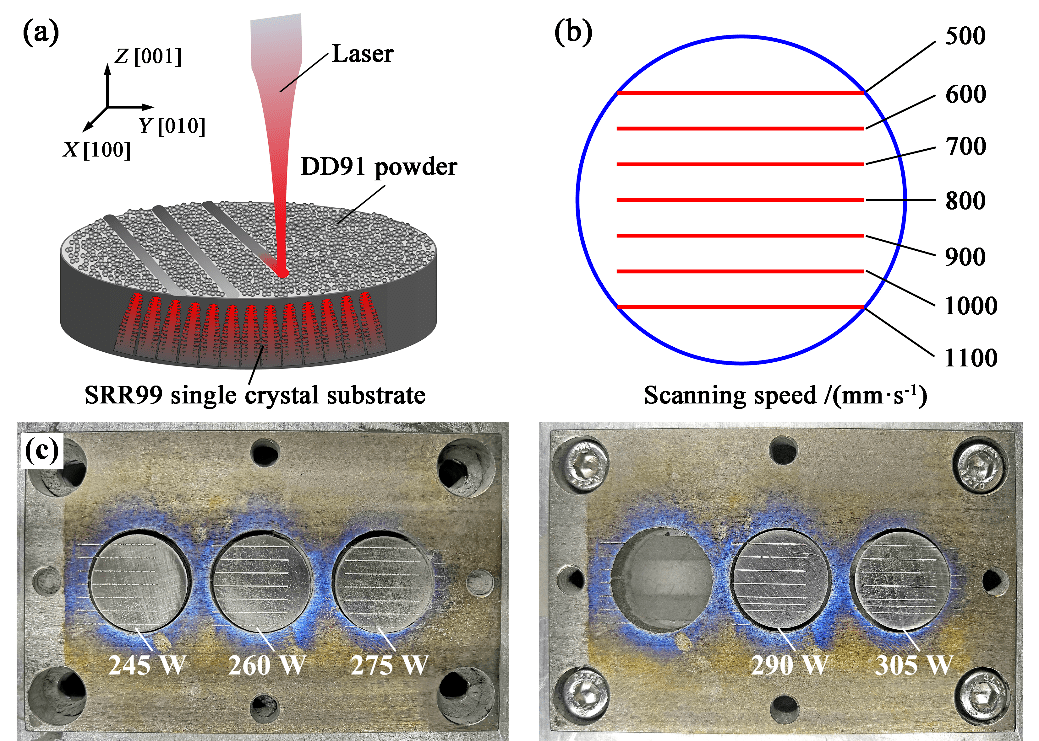 圍繞粉末床激光增材製備單晶組織的可行性,結合貴陽航發精密鑄造有限公司的應用需求,華中科技大學魏青鬆教授課題組利用激光選區熔化技術成形了DD91鎳基單晶高溫合金的單條熔道,研究了激光功率和掃描速度對單道形貌、晶體(ti) 取向和微觀組織的影響規律,並進一步探討了裂紋、雜晶等缺陷的產(chan) 生機理,為(wei) SLM製備大尺寸單晶組織奠定了基礎。