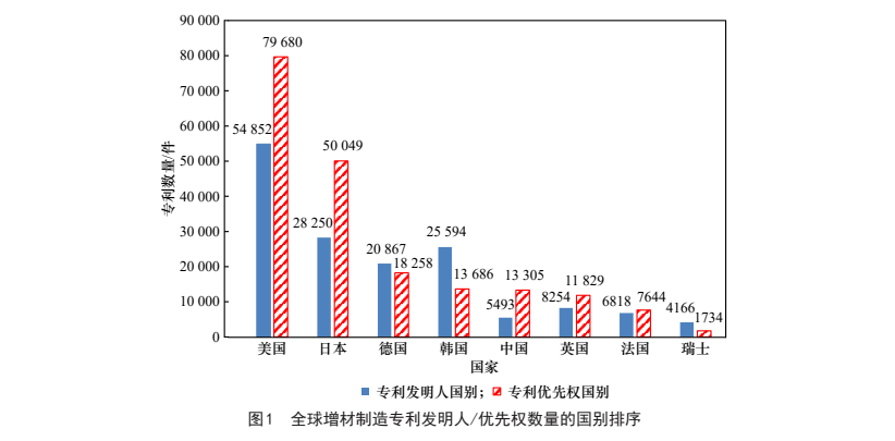 在科技論文與(yu) 專(zhuan) 利方麵,近年來國際上與(yu) 增材製造相關(guan) 的數量迅猛上升,中國、美國、德國、韓國、日本是增材製造技術研究最為(wei) 活躍的國家 [19]。將全球增材製造專(zhuan) 利申請按照發明人國別、優(you) 先權國別進行排序(見圖1)可見,美國仍保持了增材製造原創專(zhuan) 利產(chan) 出的重要地位,在增材製造核心技術方麵的創新能力較強。