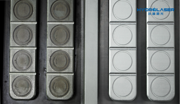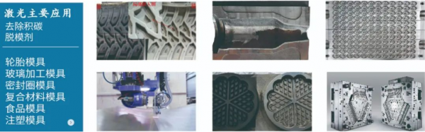 激光清洗可應用於(yu) 輪胎模具、玻璃加工模具、密封圈模具、食品模具、注塑模具等金屬或非金屬模具的清洗,可高效去除積碳、脫模劑、油汙、鏽蝕、高溫氧化層和殘膠等汙染物。相比於(yu) 用噴砂、幹冰來清洗模具存在的設備龐雜、損傷(shang) 模具基材、噪音大、耗材昂貴等缺點來講。例如:為(wei) 一副高精度模具做清洗,用傳(chuan) 統的方式如幹冰或化學清洗,需要8小時停機時間,然而用激光清洗,隻需幾分鍾便可完成,而且運行成本可以忽略不計。