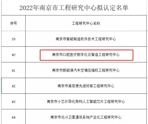 近日,由铖聯科技申報的“南京市口腔醫療數字化雲(yun) 智造工程研究中心”,經南京市發展和改革委批準認定,獲批入選2022年“南京市工程研究中心”。