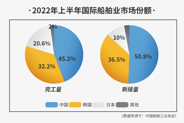 據中國船舶工業(ye) 協會(hui) 發布,2022年上半年,中國造船完工量、新接訂單量、手持訂單量分別占全球市場份額的45.2%、50.8%和47.8%,位居世界第一;其中,出口船舶占全國造船完工量、新接訂單量、手持訂單量的比重分別為(wei) 85.5%、91.0%和88.7%。