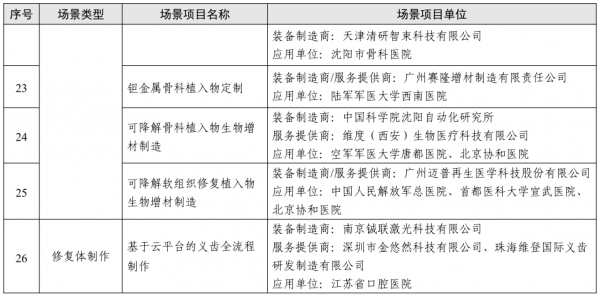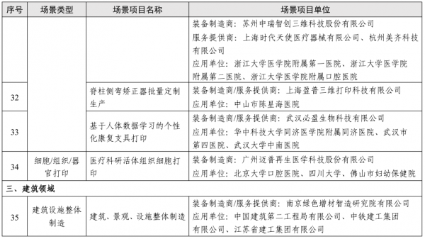 涉及的應用場景包括:複雜結構產(chan) 品輕量化設計、產(chan) 品原型快速試製、多材料結構一體(ti) 化製造、複雜結構產(chan) 品整體(ti) 化製造、零件批量生產(chan) 、專(zhuan) 用工具工裝製作、專(zhuan) 用模具製造、零件修複再製造、消費品批量定製生產(chan) 、醫療植入物定製、修複體(ti) 製作、診療輔助器具製作、個(ge) 性化矯正器具打印、細胞/組織/器官打印、建築設施整體(ti) 製造、文物複刻展示。涵蓋包括工業(ye) 、醫療、建築、文化在內(nei) 的四領域36項。