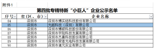 近日,深圳市中小企業(ye) 服務局發布第四批專(zhuan) 精特新“小巨人”企業(ye) 公示名單,光越科技(深圳)有限公司榮列其中,順利通過審核和公示期,榮獲國家級專(zhuan) 精特新“小巨人”企業(ye) 榮譽稱號。