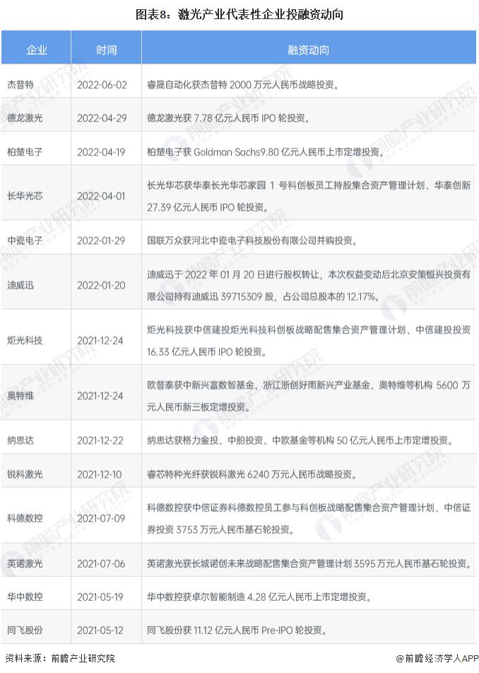 激光產(chan) 業(ye) 代表性企業(ye) 最新投融資動向