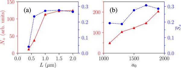 圖2正電子產(chan) 額和極化率隨(a)預等離子體(ti) 密度標長和(b)激光場強的變化。