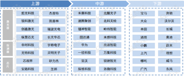 圖表2 激光雷達產(chan) 業(ye) 鏈全景(以上為(wei) 激光雷達產(chan) 業(ye) 鏈部分優(you) 秀企業(ye) )