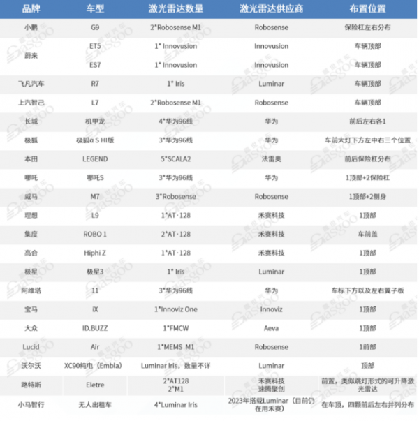 圖表3 主機廠車型激光雷達搭載情況表(以上為(wei) 部分激光雷達搭載車型)