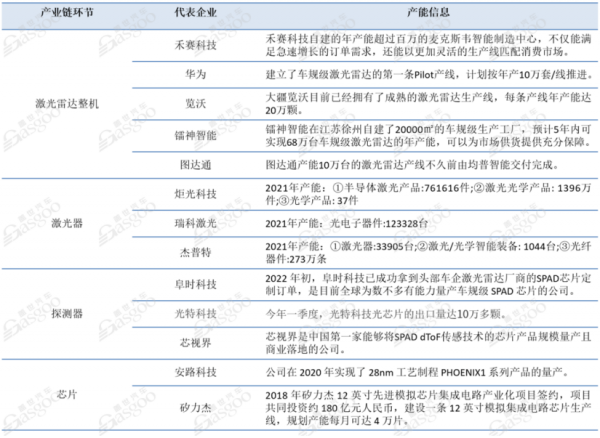 圖表5 激光雷達產(chan) 業(ye) 鏈代表企業(ye) 產(chan) 能信息
