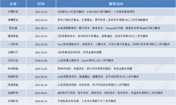 激光雷達產(chan) 業(ye) 代表性企業(ye) 最新投融資動向