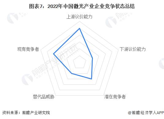 從(cong) 五力競爭(zheng) 模型角度分析,目前,我國激光產(chan) 業(ye) 屬於(yu) 高端裝備及智能製造行業(ye) ,由於(yu) 技術壁壘較高,企業(ye) 一般產(chan) 品和工藝成熟需要較長的經驗積累,目前替代品威脅較小 ; 現有競爭(zheng) 者數量較多,但市場集中度從(cong) 全行業(ye) 看相對較高 ; 上遊供應商為(wei) 光電原料、激光元器件等企業(ye) ,議價(jia) 能力較強,而下遊消費市場主要是工業(ye) 等領域,議價(jia) 能力較弱 ; 同時,因行業(ye) 資金、技術、人才門檻較高,潛在進入者威脅較小。