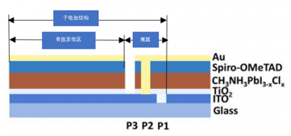 對於(yu) 鈣鈦礦薄膜太陽能模組來說,死區是一個(ge) 非常關(guan) 鍵的技術指標。眾(zhong) 所周知,薄膜太陽能模組是由一百多個(ge) 子電池串聯起來組成的,每個(ge) 子電池包含兩(liang) 個(ge) 區域:不能發電的死區與(yu) 可以發電的有效區,死區越小,有效發電麵積就越大,模組的輸出功率就越大。