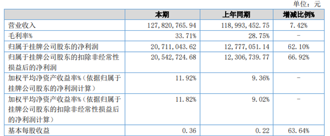 報告期內(nei) ,公司營業(ye) 收入為(wei) 127,820,765.94元,同比上升7.42%,主要係報告期公司出口國際市場形勢較好,國外銷售比上年同期有所增長,在國內(nei) 市場公司提高產(chan) 品單價(jia) ,國內(nei) 銷售穩中有升。