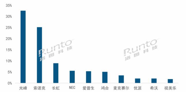教育市場出貨量完成2.6萬(wan) 台,同比下降7.4%。一方麵原因來自於(yu) ,盡管國家和各省對教育的支出持續增加,但資源持續向軟件和平台內(nei) 容而非硬件傾(qing) 斜。另一方麵是來自競品交互平板的市場壓力,液晶交互平板、智慧黑板憑借其便捷的交互功能搶占了不少市場份額。從(cong) 品牌格局來看,國產(chan) 品牌表現較好;光峰、索諾克深耕教育市場,兩(liang) 品牌市占總和高達57.8%。鴻合、希沃市場下降明顯,份額跌至5.1%和2.1%。
