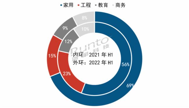 激光顯示技術已在家庭娛樂(le) 、亮化工程、商教等多個(ge) 細分市場形成全應用場景覆蓋。特別是家用市場,通過激光電視和激光中長焦形成兩(liang) 條平行產(chan) 品線 ,上半年實現了五成以上的增幅,成為(wei) 整個(ge) 激光投影市場最強的增長點。工程、教育、商務場景上半年受國內(nei) 多地散點疫情影響,項目取消或延遲,市場份額受到擠壓,均呈現負增長態勢。