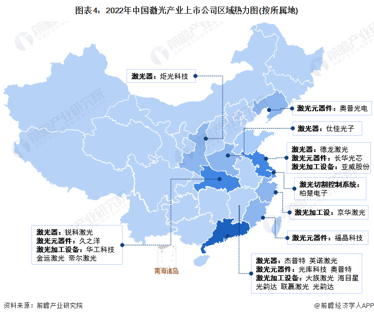 激光產(chan) 業(ye) 的上市公司中,上遊奧普光電、長華光芯以及中遊激光器的銳科激光、華工科技、傑普特幾乎全部為(wei) 激光相關(guan) 業(ye) 務,大族激光、海目星、德龍激光、英諾激光的激光相關(guan) 業(ye) 務在90%-95%之間,他們(men) 都積極拓展激光相關(guan) 建設全產(chan) 業(ye) 鏈,在各細分領域均有布局;其次是炬光科技、光韻達、聯贏激光、柏楚電子,激光相關(guan) 相關(guan) 業(ye) 務布局在80%~90%;在專(zhuan) 業(ye) 細分領域上有較強的市場競爭(zheng) 力;金運激光、光庫激光、亞(ya) 威股份、福晶科技業(ye) 務布局占公司比重在30%-50%之間,其在各自細分領域中不斷提高激光產(chan) 業(ye) 的應用比重,未來將會(hui) 繼續拓展激光相關(guan) 建設業(ye) 務。除此之外,這些上市公司基本80%-90%的業(ye) 務比重在國內(nei) ,還會(hui) 進行一部分的出口業(ye) 務。國內(nei) 方麵華東(dong) 和華南以及華中地區是較為(wei) 重點的布局區域。