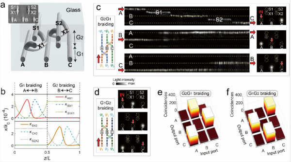 。這說明編織結果依賴於(yu) 編織順序,即光子模式的編織操作具有非阿貝爾特性,這些特性在實驗上被證實(圖3c-f)。而非阿貝爾編織的另一個(ge) 重要特性GiGi+1Gi = Gi+1GiGi+1也在實驗上被成功表征。