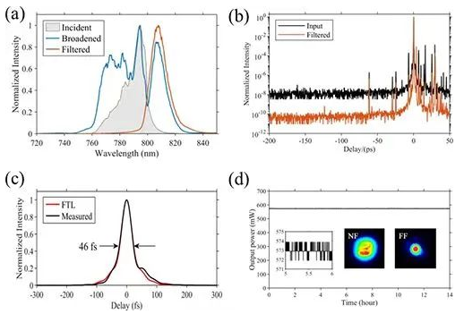 隨著超短超強激光技術的發展,目前人們已經能夠在數十飛秒的光脈衝中產生高達10PW的峰值功率,聚焦光強超過了1023W/cm²。這樣的光場能夠在實驗室內創造出具備超高能量密度、超高溫度、超強光電場、超強磁場和超快時間尺度的綜合性極端物理條件,在激光加速、激光聚變、等離子體物理、材料科學、阿秒科學等領域具有重要應用。然而對於(yu) 具有預脈衝(chong) 與(yu) 自發輻射基底的飛秒脈衝(chong) 而言,光強提升的同時也會(hui) 導致這些噪聲的提升,當噪聲光強超過10¹¹W/cm²時,所產(chan) 生的預電離等效應會(hui) 嚴(yan) 重影響主脈衝(chong) 與(yu) 物質相互作用的效果,因此提升主脈衝(chong) 與(yu) 噪聲強度的比值,即時間對比度,是超快超強激光脈衝(chong) 需要重點關(guan) 注的研究內(nei) 容之一。中國科學院物理研究所/北京凝聚態物理國家研究中心魏誌義(yi) 研究團隊多年來一直致力於(yu) 飛秒脈衝(chong) 激光放大及時間對比度提升的研究。早在2010年他們(men) 提出過非共線飛秒光參量放大產(chan) 生高對比度種子脈衝(chong) 的方法,將對比度提升到了10⁻¹¹量級【Opt. Lett. 35, 3096(2010)】,並應用於(yu) 飛秒超強激光係統中,研製成功對比度達10⁻¹⁰量級、峰值功率達1.16PW的飛秒超強激光,不僅(jin) 有效解決(jue) 了對比度的問題,還創造了該類研究當時的最高峰值功率【Opt. Lett. 36, 3194(2011)】。在國家“十二五”重大基礎設施建設項目的支持下,近年來該研究組承擔了北京懷柔“綜合極端條件用戶裝置”中超快光場係統的部分工作。在飛秒激光超快實驗子係統(XD1)的研究建設任務中,該組博士後王羨之通過與(yu) 子係統負責人王兆華副研究員、合作導師魏誌義(yi) 研究員的密切合作,提出了通過在單塊非線性晶體(ti) 中級聯兩(liang) 個(ge) 二階非線性過程並配合光譜濾波提升飛秒放大激光對比度的新方案,利用極為(wei) 簡單的結構直接產(chan) 生了脈衝(chong) 能量數百微焦耳的高穩定高對比度飛秒激光脈衝(chong) 。圖1 係統結構圖。SPF:短通濾波片。LPF:長通濾波片其原理方案如圖1所示,由前級飛秒激光放大器輸出的光脈衝經過第一塊濾波片光譜整形之後入射到BBO非線性晶體中先產生二倍頻,之後倍頻光與基頻光的短波部分進行差頻產生波長更長的閑頻光;新產生的閑頻光被第二塊濾波片選出。在3mJ入射能量下,得到了單脈衝能量570μJ、主脈衝對比度高達10⁻¹¹的輸出結果,且在14小時內的平均功率抖動RMS低至0.076%。該工作通過級聯兩個二階非線性過程,在較低的入射光強下得到了等效於三階非線性效應的對比度提升效果,無需真空係統,且兩個過程發生在同一塊晶體中,也無需延時控製,因此可以在空氣中直接產生數百微焦的高穩定高對比度飛秒脈衝,大大簡化了對比度提升單元的結構,在飛秒超強激光裝置研究中具有極大的應用潛力。圖2. 產生的高對比度飛秒激光脈衝的參數:(a) 各個位置處的光譜;(b) 入射脈衝與輸出脈衝的時間對比度;(c)輸出脈衝寬度;(d) 輸出脈衝的功率穩定性以及近遠場光斑分布相關結果發表於最近的Optics Letters【Vol. 47, No. 19, pp. 4981-4984 (2022)】上。這也是該團隊在飛秒激光時間對比度提升方麵最新獲得的創新成果,並為懷柔綜合極端條件用戶裝置中飛秒激光超快實驗子係統的建設提供了重要支撐。前序成果包括Chin. Phys. Lett, 31, 014207(2014)、Chin. Phys. Lett, 34, 024205(2017)、Chin. Phys. Lett, 38, 074202(2021)等。這項工作也得到了中科院先導專項和國家自然科學基金的支持。
