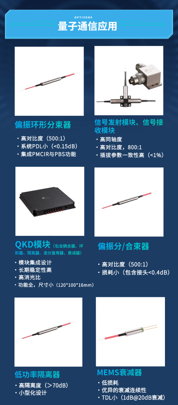 此外光越科技研發生產(chan) 量子通信應用領域產(chan) 品還包含:自由空間輸出的PBS和PMCIR模塊、高功率保偏環形器、高功率保偏隔離器、可調光衰減器、準直器、保偏環形器、保偏分束器、光纖透鏡、帶通濾波器、保偏波分複用器、保偏光纖陣列、保偏耦合器。