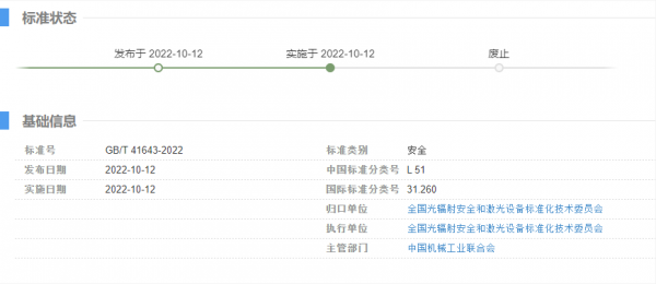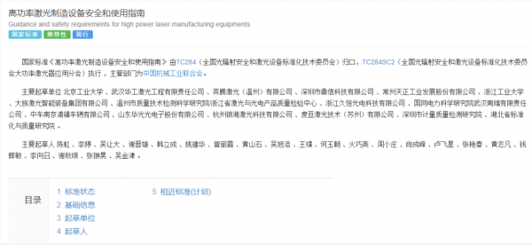 國家標準GB/T 41265-2022《高功率激光製造設備安全和使用指南》於(yu) 10月12日在中華人民共和國國家標準公告2022年第13號發布,並於(yu) 2022年10月12日實施。該標準由TC284(全國光輻射安全和激光設備標準化技術委員會(hui) )歸口,TC284SC2(全國光輻射安全和激光設備標準化技術委員會(hui) 大功率激光器應用分會(hui) )執行。 2019 年12月31日,國家標準化管理委員會(hui) 下達2019年第四批推薦性國家標準計劃《高功率激光製造設備安全和使用指南,計劃編號為(wei) 20194046-T-604。推動標準實施,讓標準成為(wei) 對質量的“硬約束”是國家“十三五”發展建設規劃的重要任務之一。本任務是SAC/TC284“十三五”規劃立項的標準之一,全國光輻射安全和激光設備標準化技術委員會(hui) (SAC/TC284)響應國家“十三五”發展建設規劃,製定了《高功率激光製造設備安全和使用指南》。 該標準由北京工業(ye) 大學主起草,武漢華工激光工程有限責任公司、奔騰激光(溫州)有限公司、深圳市鼎信科技有限公司、常州天正工業(ye) 發展股份有限公司、浙江工業(ye) 大學、大族激光智能裝備集團有限公司、溫州市質量技術檢測科學研究院/浙江省激光與(yu) 光電產(chan) 品質量檢驗中心、浙江久恒光電科技有限公司、國網電力科學研究院武漢南瑞有限責任公司、中車南京浦鎮車輛有限公司、山東(dong) 華光光電子股份有限公司、杭州銀湖激光科技有限公司、度亙(gen) 激光技術(蘇州)有限公司、深圳市計量質量檢測研究院、湖北省標準化與(yu) 質量研究院參與(yu) 起草。主要起草人 陳虹、李婷、吳讓大、謝晉雄、韓立成、姚建華、曾麗(li) 霞、黃山石、吳旭浩、王璞、何玉朝、火巧英、周小莊、肖成峰、盧飛星、張豔春、黃誌凡、錢輝敏、李向召、謝秋琪、張翀昊、吳金津。