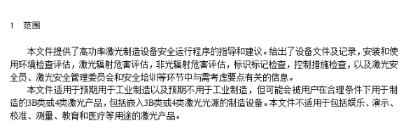 本標準提供了高功率激光製造設備安全運行程序的指導和建議。給出了設備文件及記錄,安裝和使用環境檢查評估,激光輻射危害評估,非光輻射危害評估,標識標記檢查,控製措施檢查,以及激光安全員、激光安全管理委員會(hui) 和安全培訓等環節中與(yu) 需考慮要點有關(guan) 的信息。