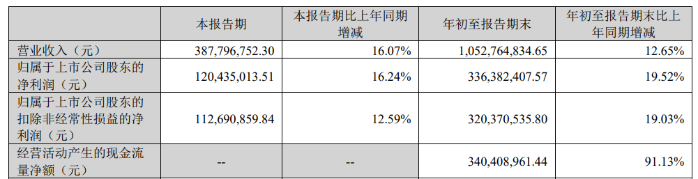 今年第三季度,帝爾激光實現營業(ye) 收入3.88億(yi) 元,同比增長16.07%;歸屬於(yu) 上市公司股東(dong) 的淨利潤1.20億(yi) 元,同比增長16.24%;歸屬於(yu) 上市公司股東(dong) 的扣除非經常性損益的淨利潤1.13億(yi) 元,同比增長12.59%。