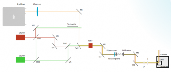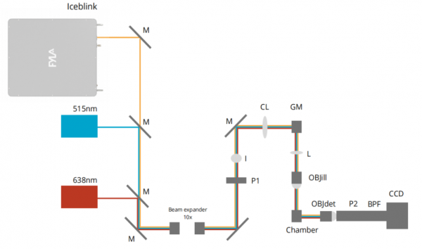 這種設置包括一個(ge) 超連續激光光源(Iceblink),兩(liang) 個(ge) 用於(yu) 引導光線的鏡子,一個(ge) (或兩(liang) 個(ge) ,取決(jue) 於(yu) 探測器)中性密度濾光片,用於(yu) 降低光線強度,避免飽和相機和偏振器。