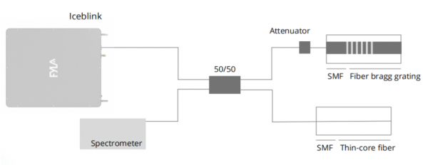 該設置顯示了光纖傳(chuan) 感器係統。它由一個(ge) 超連續激光光源(Iceblink)、一個(ge) 0.3 nm分辨率的光柵式光譜儀(yi) (IBSEN I-MON 512)和一個(ge) 2×2耦合器(ThorLabs,TW1550R5A2)組成。