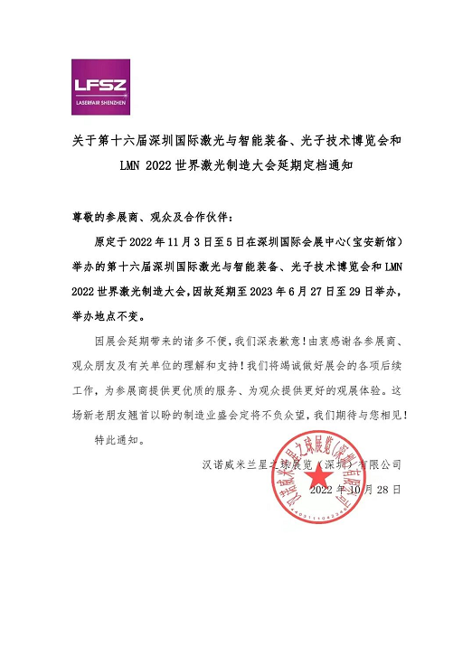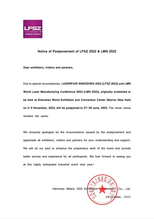 Due to special circumstances, LASERFAIR SHENZHEN 2022 (LFSZ 2022) and LMN World Laser Manufacturing Conference 2022 (LMN 2022), originally scheduled to be held at Shenzhen World Exhibition and Convention Center (Bao’an New Hall) on 3-5 November, 2022, will be postponed to 27-29 June, 2023. The show venue remains the same.