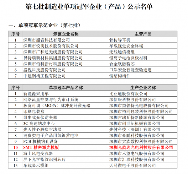 近日,工業(ye) 和信息化部、中國工業(ye) 經濟聯合會(hui) 組織開展的第七批製造業(ye) 單項冠軍(jun) 企業(ye) (產(chan) 品)和第一批、第四批製造業(ye) 單項冠軍(jun) 企業(ye) (產(chan) 品)評選已審核完成並正式公布。光韻達旗下SMT精密激光模板憑借單一產(chan) 品數量及銷售額國內(nei) 第一的硬實力成功入選“單項冠軍(jun) 產(chan) 品”。