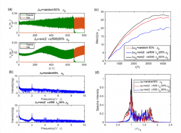 //////////////// 圖1 基於(yu) 快速延伸等離子體(ti) 光柵的激光壓縮原理圖 圖1為(wei) 快速延伸等離子光柵激光壓縮原理。其中淺綠色的為(wei) 氣體(ti) 光柵,紅色的為(wei) 長脈衝(chong) 泵浦光,橙色的脈衝(chong) 為(wei) 電離脈衝(chong) 、深綠色的為(wei) 等離子體(ti) 光柵,藍色的為(wei) 反射脈衝(chong) 。圖1中泵浦光低於(yu) 氣體(ti) 的電離閾值,能直接穿過氣體(ti) 光柵。電離脈衝(chong) 為(wei) 高於(yu) 氣體(ti) 電離閾值的短脈衝(chong) ,氣體(ti) 光柵電離成等離子體(ti) 光柵時,等離子體(ti) 光柵的邊界隨著電離脈衝(chong) 以光速延伸。由於(yu) 等離子體(ti) 光柵的折射率變化為(wei) 氣體(ti) 光柵的兩(liang) 個(ge) 數量以上,形成的等離子體(ti) 光柵將對泵浦光全反射。由於(yu) 反射麵以光速移動,反射後的泵浦光在時間上疊加成一個(ge) 短脈衝(chong) 。 以氫氣氣體(ti) 光柵作為(wei) 背景氣體(ti) ,研究人員引入1μm的泵浦激光和800 nm,30fs的電離激光,采用Opic和EPOCH粒子模擬程序對壓縮過程進行了模擬。圖2為(wei) 不同泵浦光強度下的一維和二維模擬結果。其中圖2(a)和圖2(b)分別給出了振幅放大倍數和壓縮比。圖2(a)顯示在不同泵浦強度下(1012-5×1013W/cm2)的振幅放大率,粒子模擬結果和解析解(虛線)在壓縮初期階段精確吻合,隨後由於(yu) 等離子體(ti) 不穩定性和群速度色散的影響偏離,最終反射光的振幅能達到泵浦光25倍以上(600倍以上的光強)出現飽和。圖2(b)顯示在不同泵浦強度下的壓縮比,模擬結果顯示壓縮比能到達2000-6000。圖2(c)給出了二維粒子模擬的壓縮脈衝(chong) 演化情況,其中激光脈寬由40ps壓縮到10fs,光強由5×1013W/cm2放大到9×1016W/cm,壓縮效率約為(wei) 35%。圖2(c)中泵浦光和電離脈衝(chong) 都為(wei) 高斯分布,改成6階超高斯分布後,壓縮效率達到60%以上。 為(wei) 研究壓縮機製的穩定性,研究人員開展了非均勻等離子體(ti) 下的激光壓縮粒子模擬。圖3顯示了激光在非均勻等離子體(ti) 光柵中的激光壓縮效果。模擬結果顯示,當采用幅度為(wei) 50%平均密度的隨機和正弦密度抖動時,壓縮激光強度仍然保持良好的放大,其振幅達到泵浦激光的15倍以上(200倍以上的光強)。同時,等離子光柵的頻率和激光的光譜幾乎不受影響。 圖2 (a)不同泵浦強度下的振幅放大率。(b)不同泵浦強度下的壓縮比。(c)二維壓縮脈衝(chong) 的演化模擬結果。其中等離子體(ti) 光柵平均密度為(wei) 0.02nc,光柵振幅為(wei) 50%平均等離子密度。 圖3 非均勻等離子體(ti) 光柵的激光壓縮模擬結果。(a)幅度為(wei) 50%的隨機和正弦密度抖動等離子體(ti) 光柵。(b)不同密度抖動下的壓縮激光振幅增長曲線。(c)不同密度抖動下的光柵頻率。(d)不同密度抖動下的壓縮激光光譜。 論文原文: Zhaohui Wu, Yanlei Zuo, Xiaoming Zeng, Zhaoli Li, Zhimeng Zhang, et al, "Laser compression via fast-extending plasma gratings", Matter and Radiation at Extremes 7, 064402 (2022) https://doi.org/10.1063/5.0109574