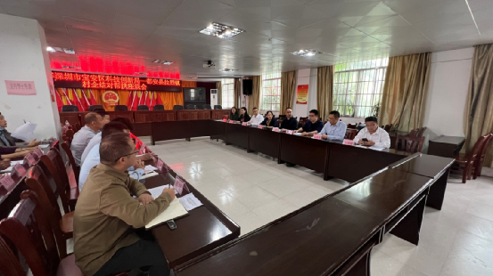 深圳市寶安區科協秘書(shu) 長、寶安科技館張小萍館長(牌右)代表愛心企業(ye) 向拉烈鎮黨(dang) 委書(shu) 記唐斌(牌左)捐贈幫扶資金;自治縣黨(dang) 委常委、副縣長譚意浩(後中) 到會(hui) 祝賀