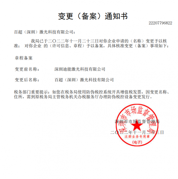 根據瑞士百超集團的戰略部署,更全麵、更有效地推動各項業(ye) 務在中國的發展,為(wei) 客戶提供更優(you) 質的全球化支持和服務,瑞士百超集團全資子公司——深圳迪能激光科技有限公司,於(yu) 2022年11月23日經深圳市市場監督管理局核準,公司名稱做如下變更: