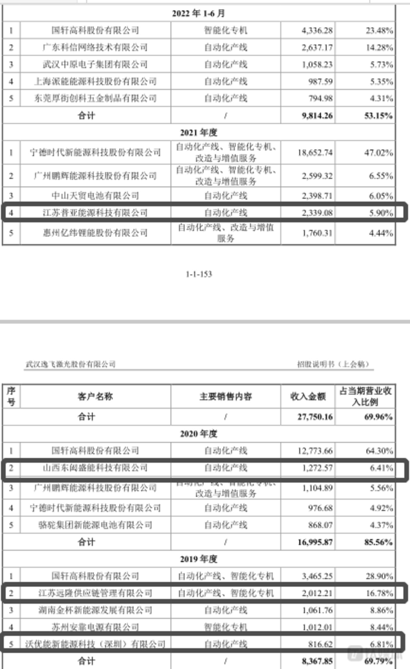 招股說明書(shu) 顯示,2019年和2020年,逸飛激光向國軒高科產(chan) 生的銷售收入分別為(wei) 3465.25萬(wan) 元、12773.66萬(wan) 元,國軒高科也霸占著逸飛激光的第一大客戶頭銜。然而,2021年,國軒高科不僅(jin) 不是逸飛激光的第一大客戶更是從(cong) 前五大客戶名單中消失,到了2022年上半年,國軒高科又成為(wei) 了逸飛激光的第一大客戶。