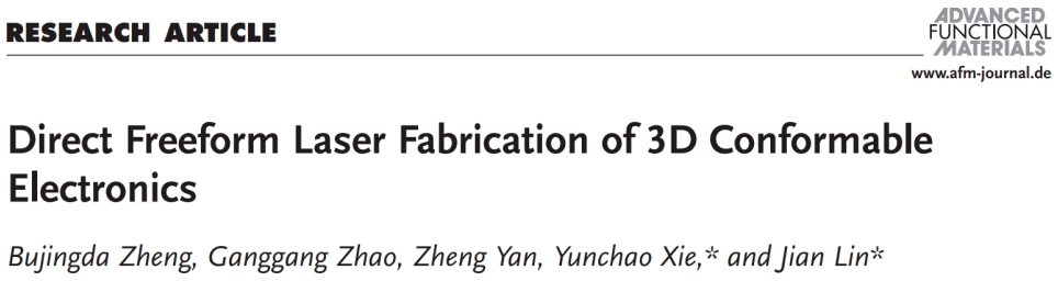 近日,相關(guan) 論文以《三維穩定電子器件》(Direct Freeform Laser Fabrication of 3D Conformable Electronics)為(wei) 題,發表在 Advanced Functional Materials 上[5]。