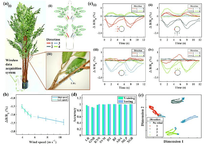 最後,在仿真植物上,研究團隊集成了基於(yu) 激光誘導石墨烯的應變傳(chuan) 感器,結合人工智能算法之後,他們(men) 發現能用於(yu) 探測室內(nei) 風速和風向的變化,從(cong) 而為(wei) 物聯網智能家居的應用設計提供新思路。