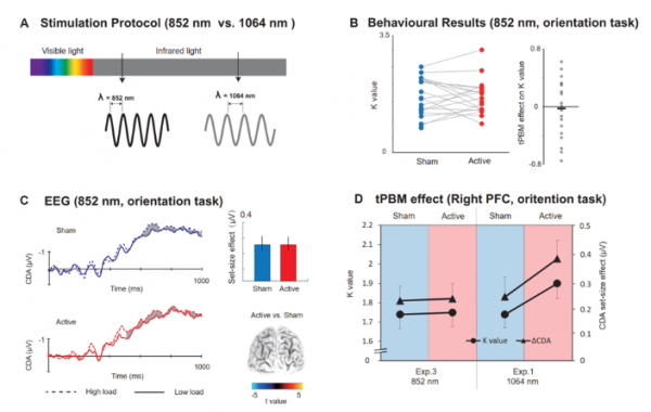 同時,研究者還發現光生物調節技術對工作記憶的行為(wei) 改善具有波長和腦區特異性。如圖3所示,實驗三發現隻有1064 nm的光刺激可以改善個(ge) 體(ti) 的工作記憶容量,而產(chan) 生熱量一致的852 nm的光生物調節刺激則不會(hui) 產(chan) 生行為(wei) 以及電生理上的顯著變化。另外,實驗四通過變更刺激腦區,發現1064 nm的光刺激對個(ge) 體(ti) 的工作記憶的提升效應消失。